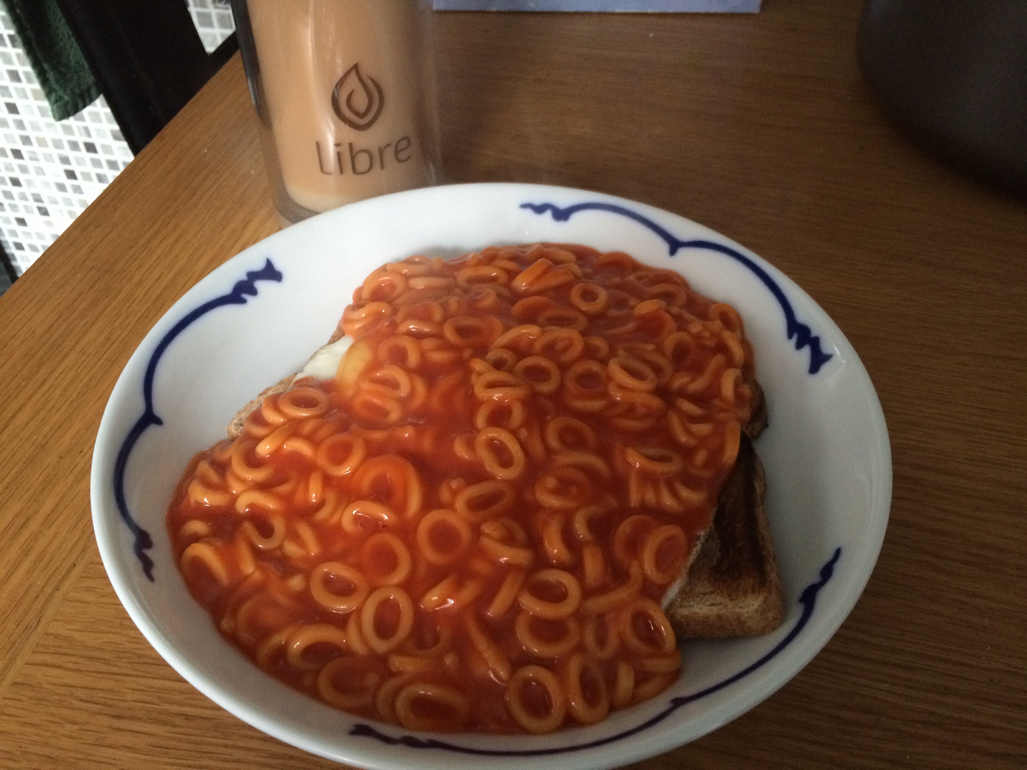 Breakfast: 2 slices of 400g wholemeal toast (HEB) with a 400g tin of spaghetti hoops, 2 fried eggs and a flask of tea with sweetener and semi skimmed milk (HEA)