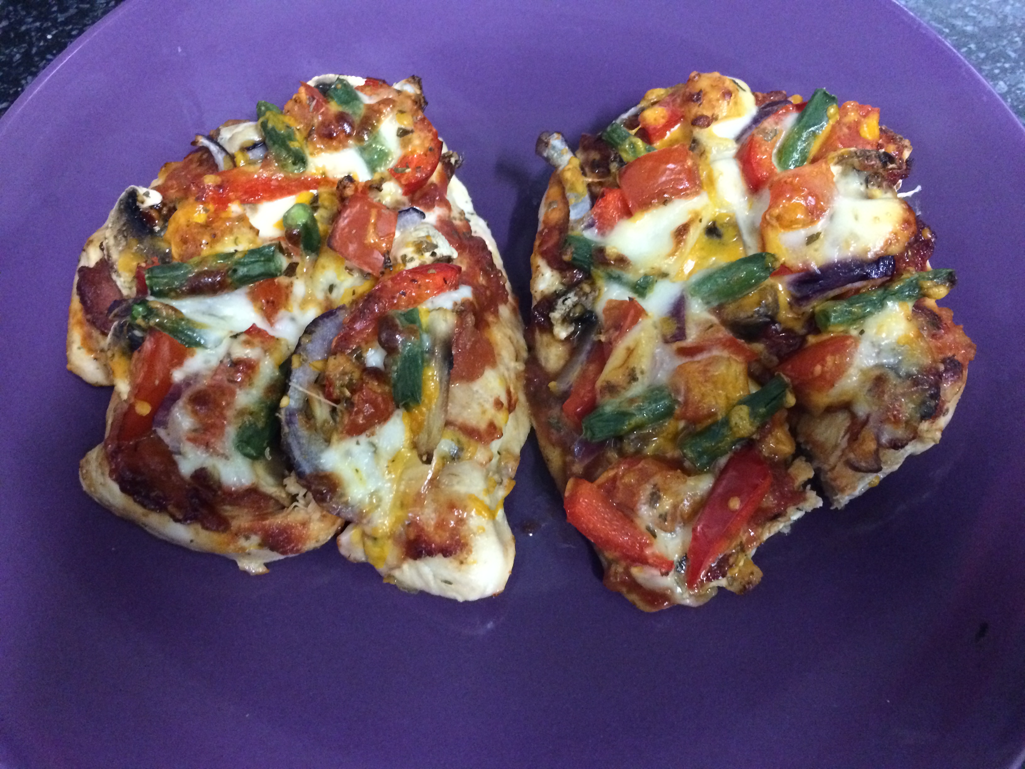 Dinner: I had a few chips and I made chicken (s) pizza with peppers (s), onions (s), mushrooms (s), tomatoes (s), green beans (s) and some mozzarella (HEA).