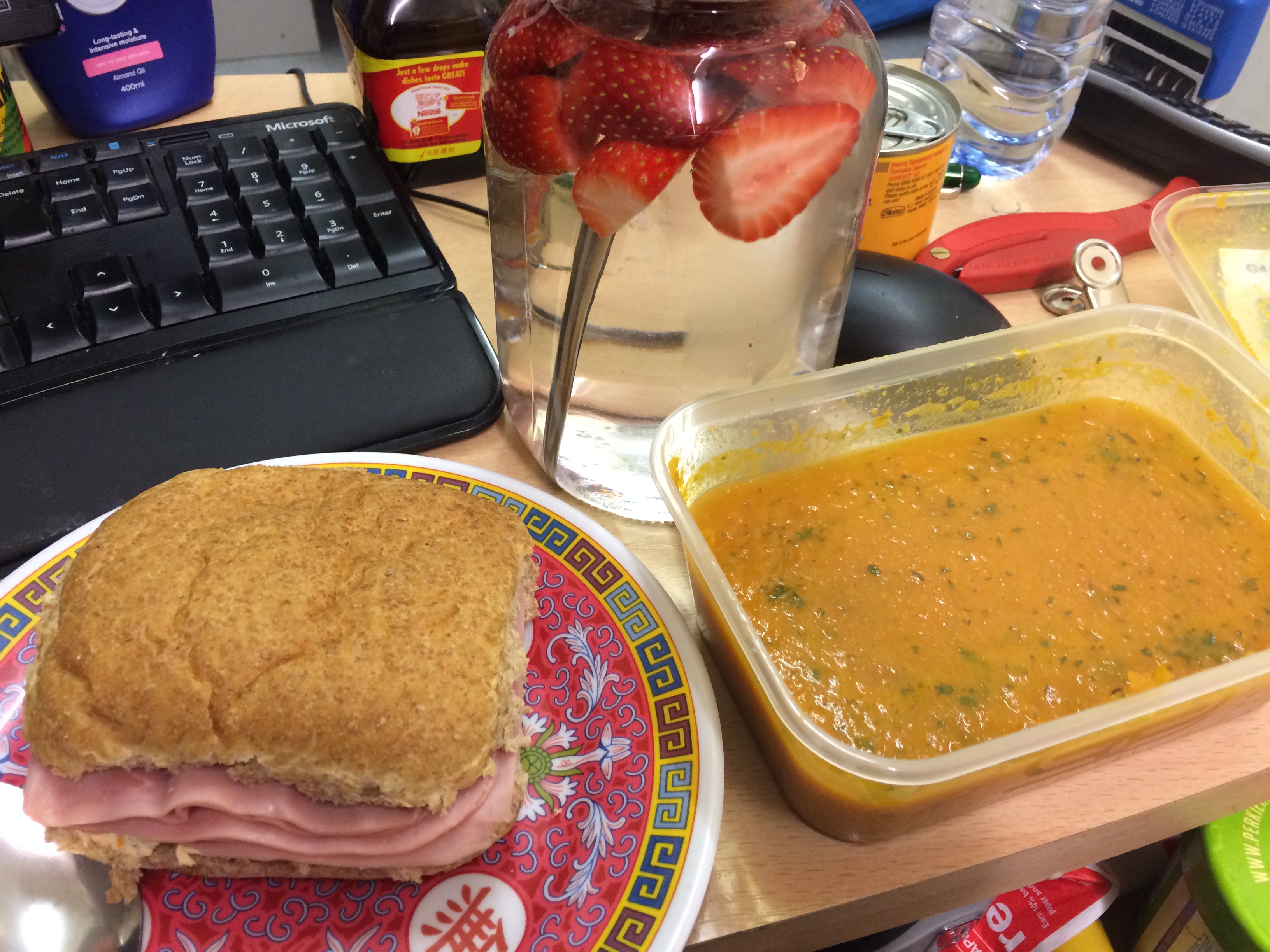 Lunch was carrot (s) and coriander soup with a wholemeal roll (HEB) with 30g Phili light (half HEA) and ham with strawberry infused water and 2 clementines (s)