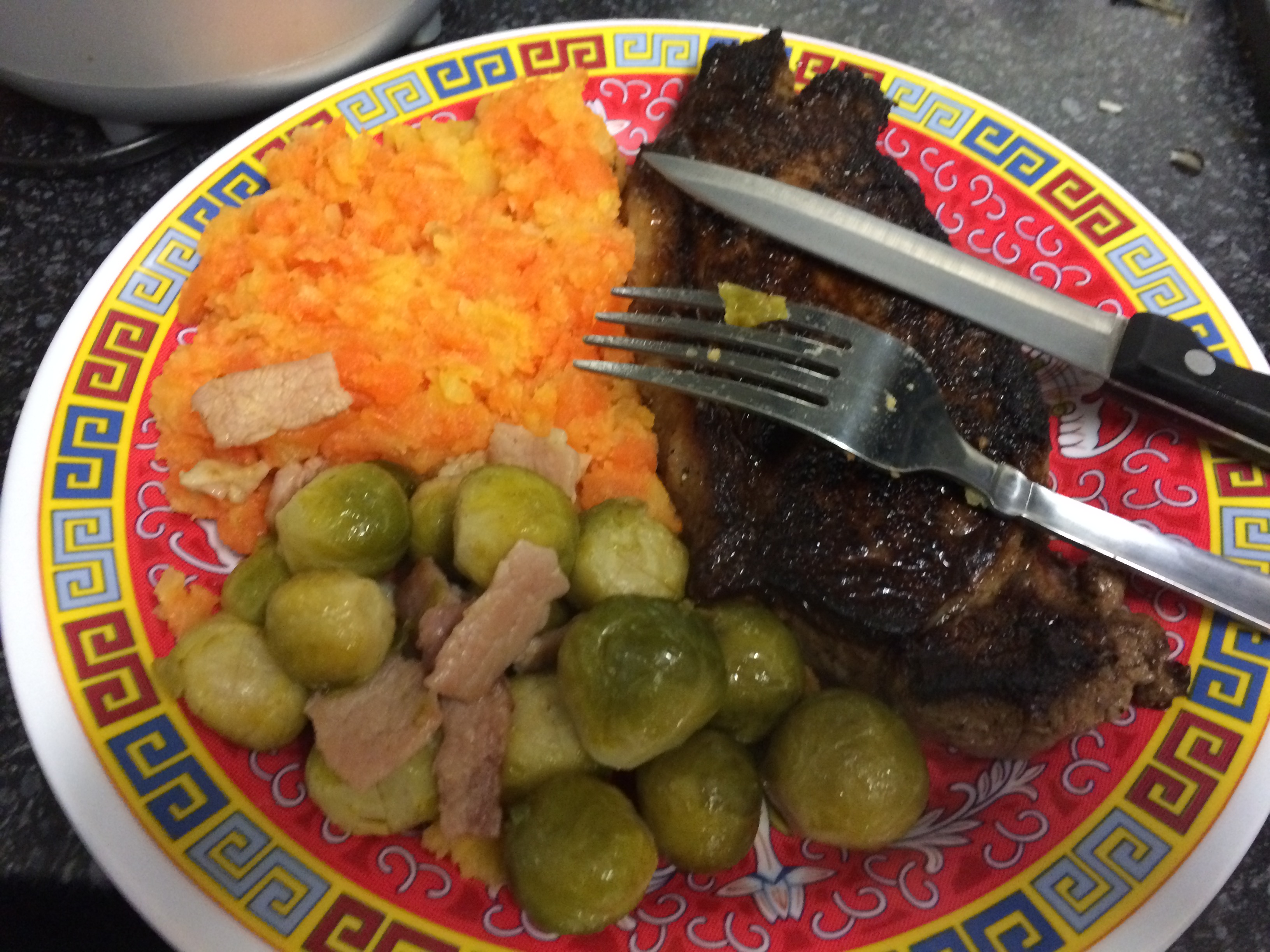 Dinner: ‘blackened’ steak with the fat removed (p) with swede (s) and carrot (s) mash with sprouts (s) and bacon (p)