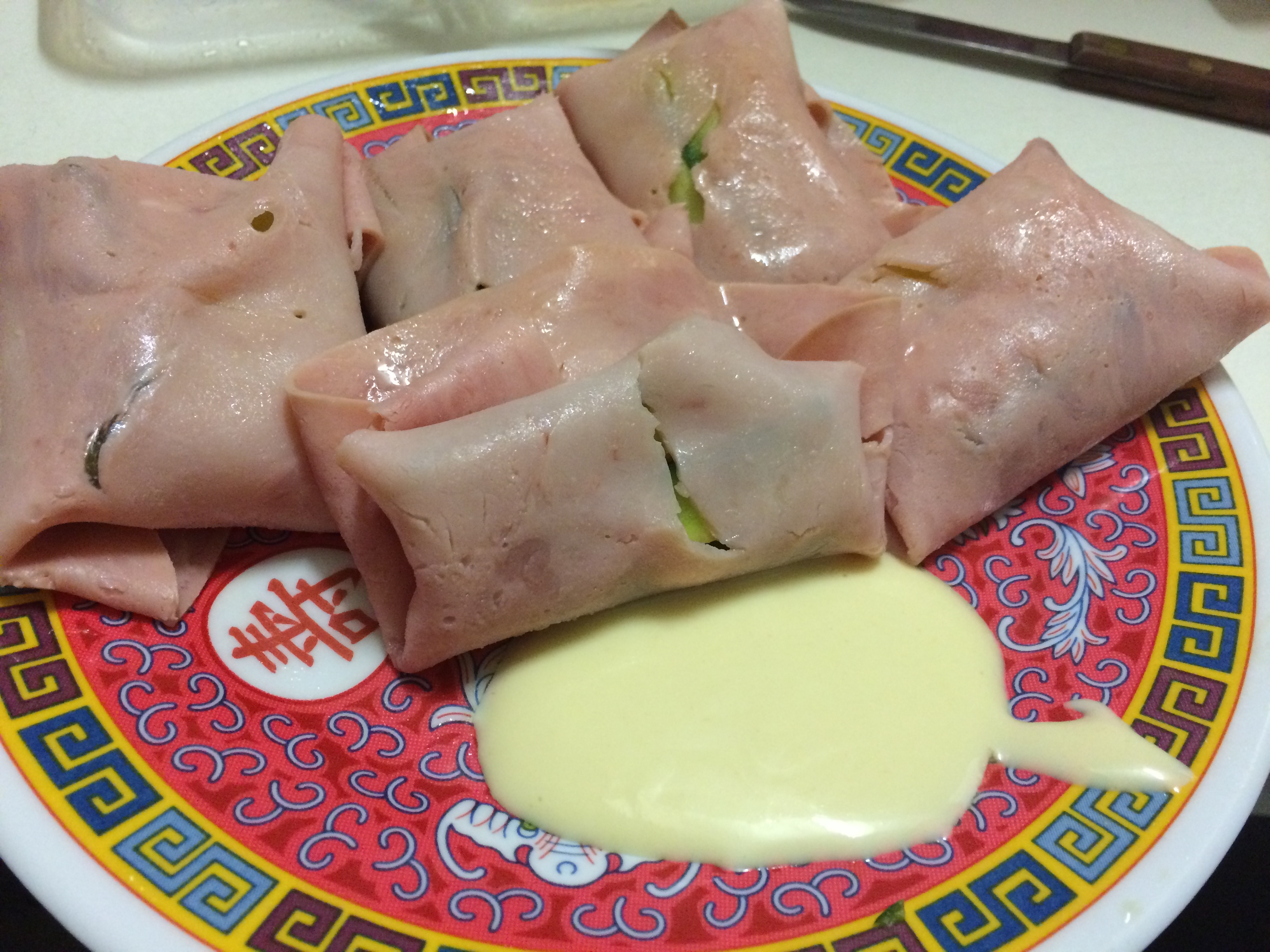 Snack: ham (p) and cucumber (s) parcels with light salad cream (3 syns) and clementine (s) with strawberries (s) and 25g wasabi peas (4.5 syns)