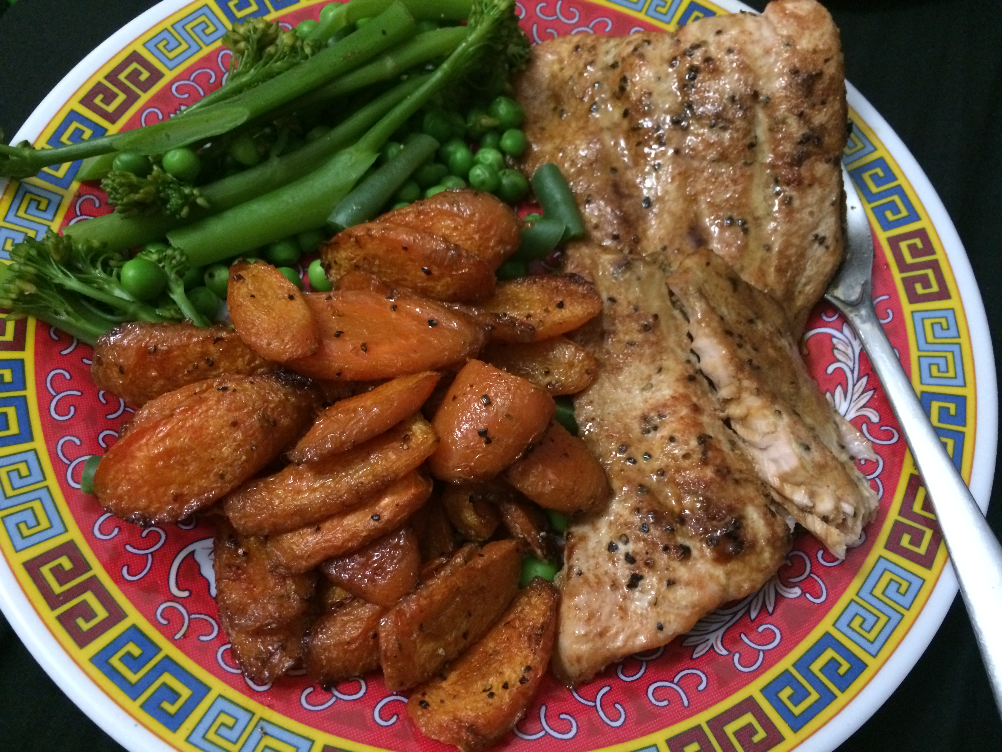 Dinner: soy salmon (p) with roast carrots (s), broccoli (s), green beans (s) and peas (p)