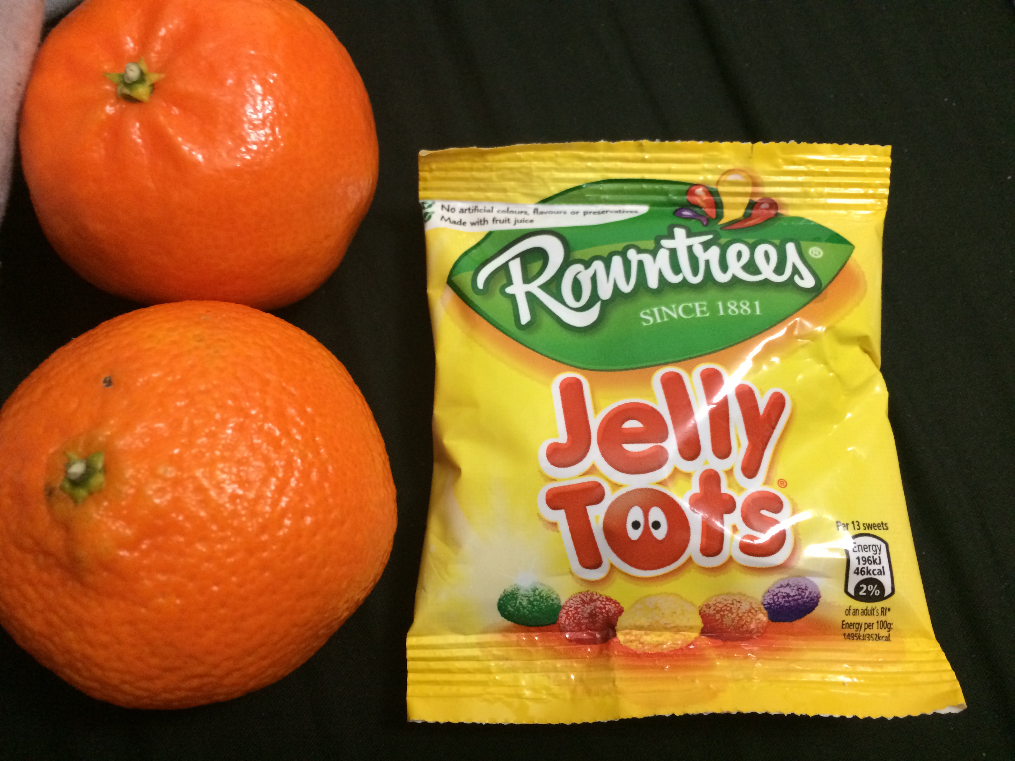 Snack: 2 clementines (s) and half a bag of jelly tots (4 syns)