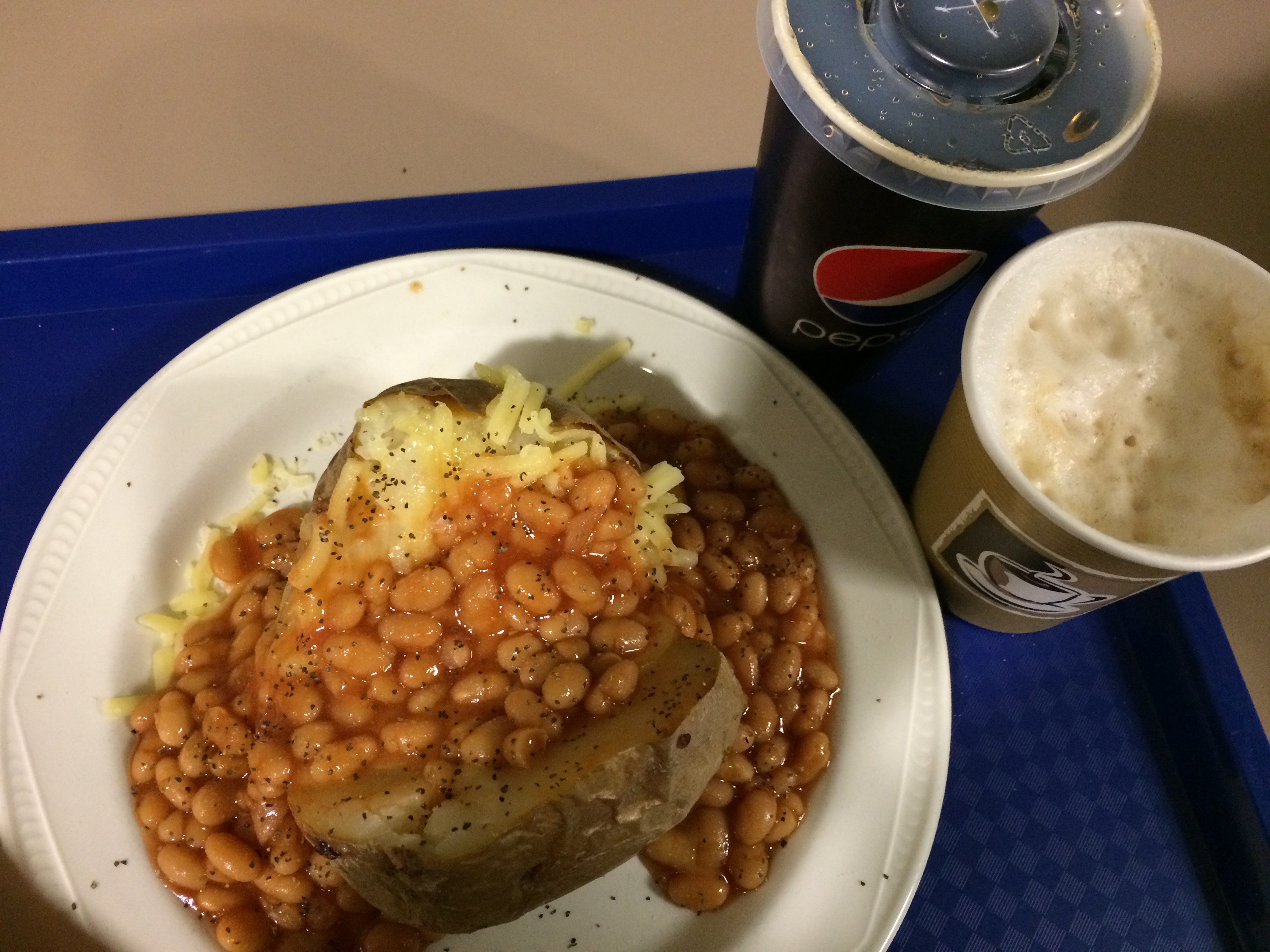 College: jacket potato with cheese (HEA) and baked beans with a Pepsi Max and a cappuccino (2 syns for milk)