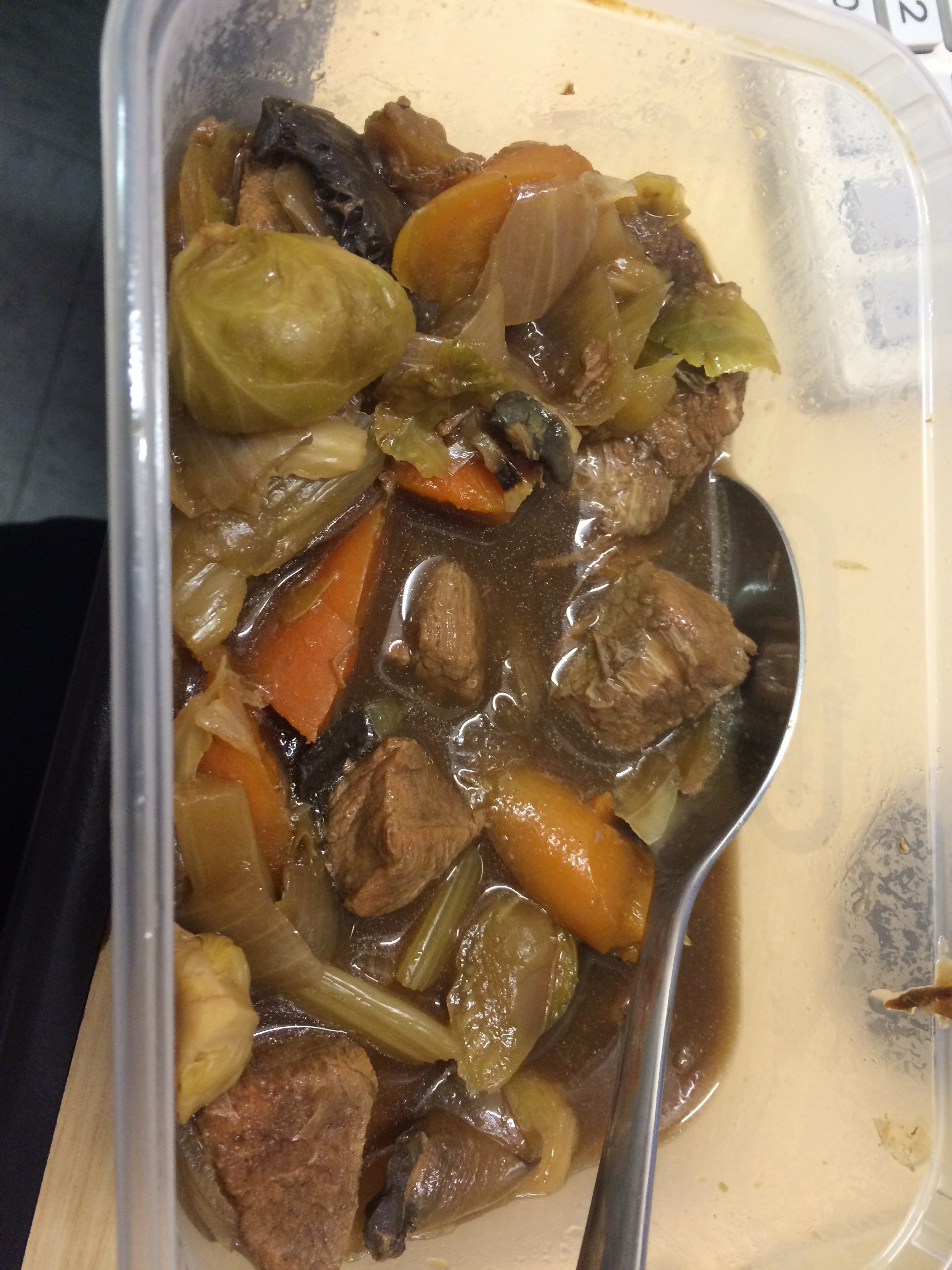 Dinner: beef stew (p) with broccoli (s), mangetout (s), carrots (s), green beans (s) and pickled beetroot (s)