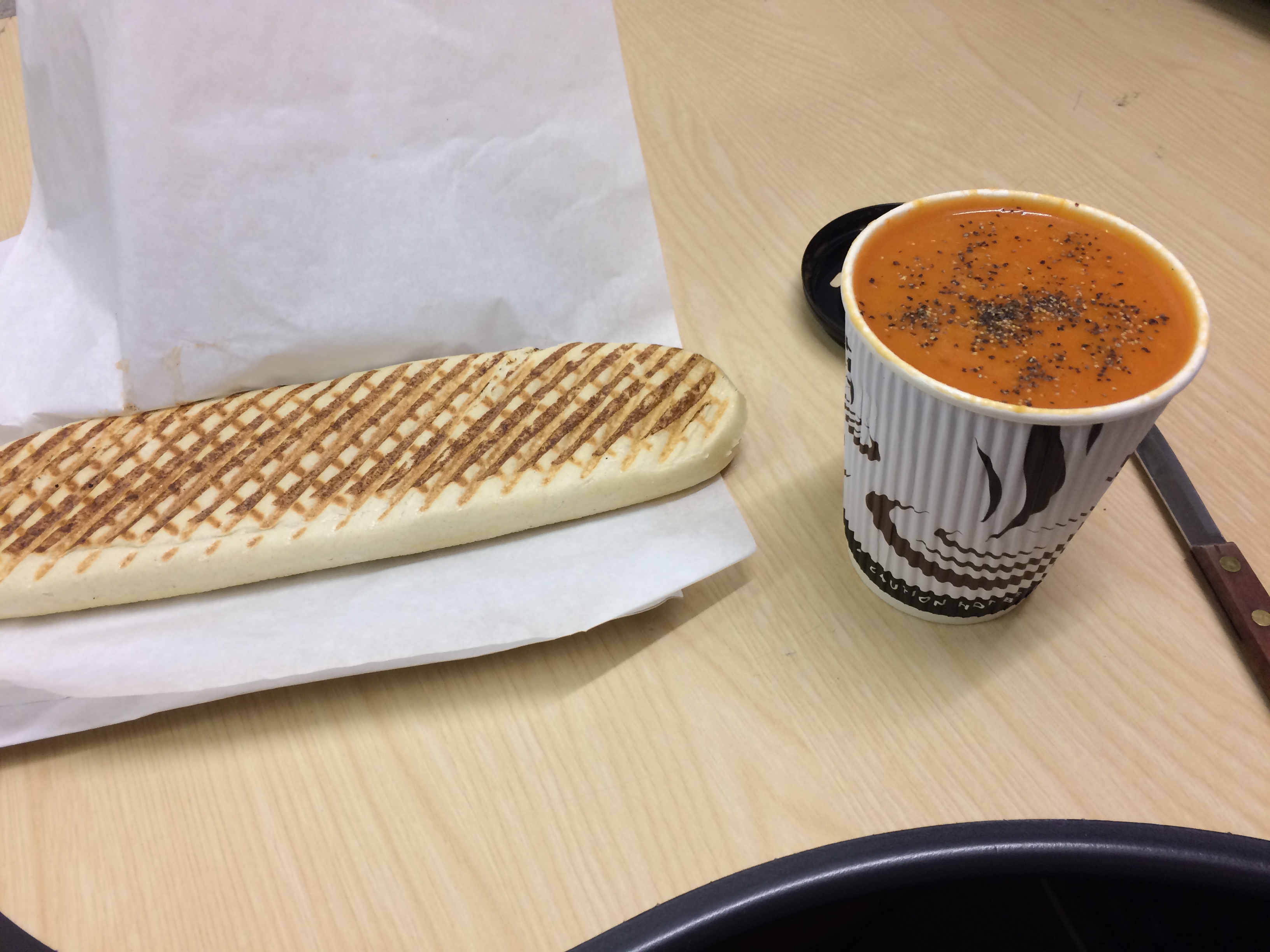 Lunch: ham (p) and veg (s) quiche with pea soup (p) and ham (p) and cucumber (s) on a wholemeal roll (HEB)