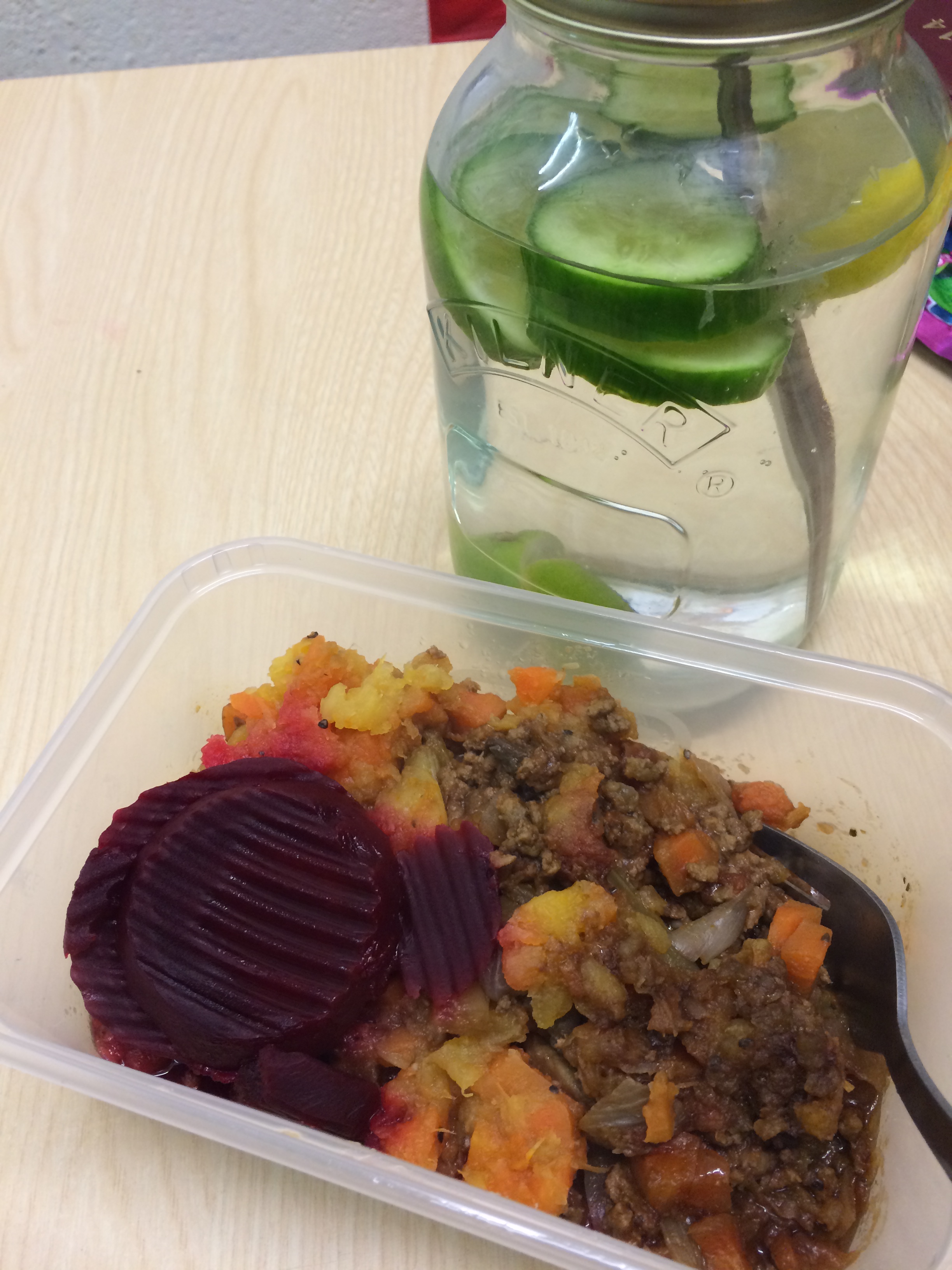 Lunch: soy salmon (p) with carrot (s) and swede (s) mash with celery sticks (s) and a clementine (s) with strawberry and cucumber infused water