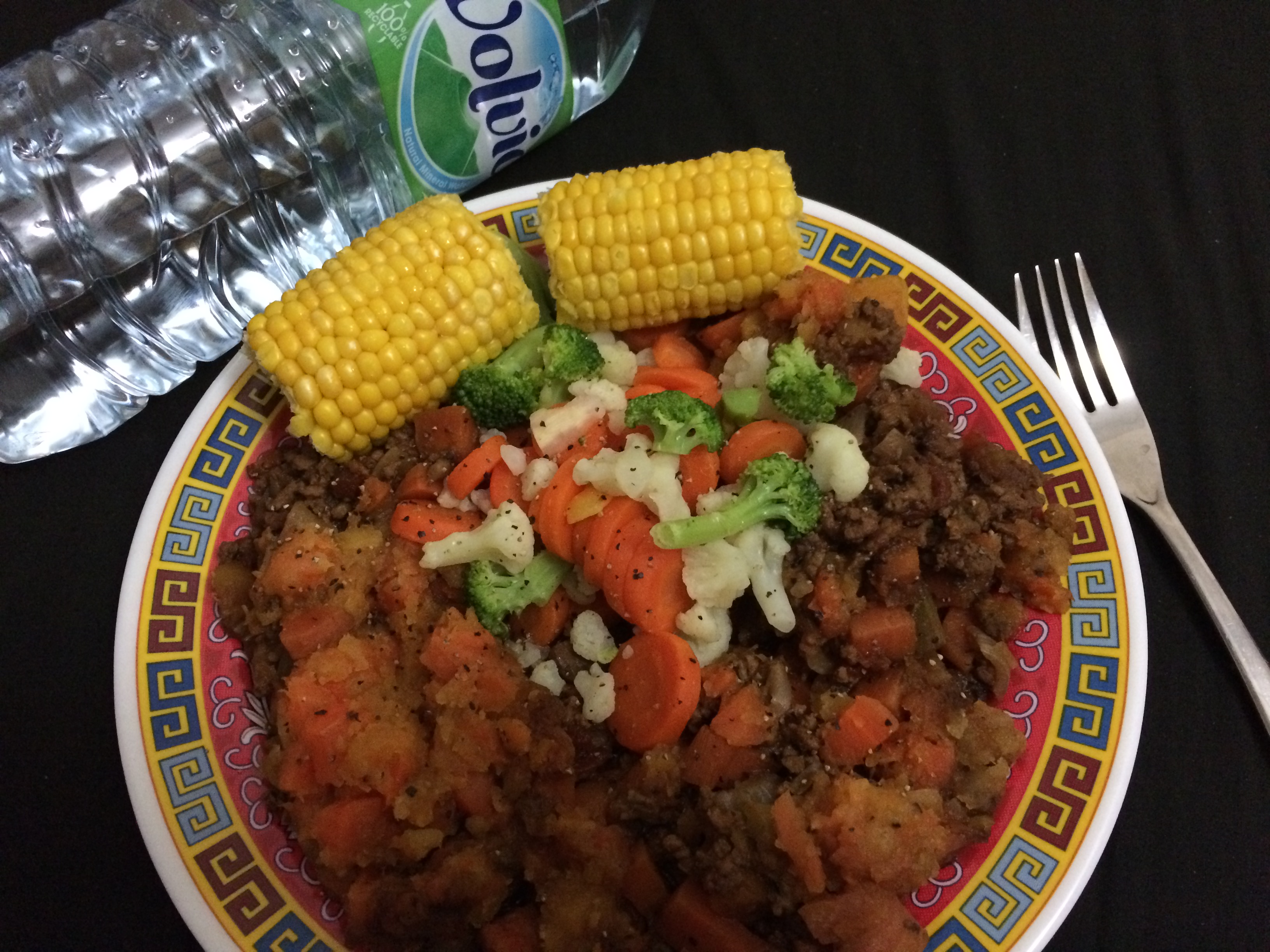 Lunch: lean corned beef hash with roast carrots, potatoes, sprouts, peas and pickled beetroot (not pictured)