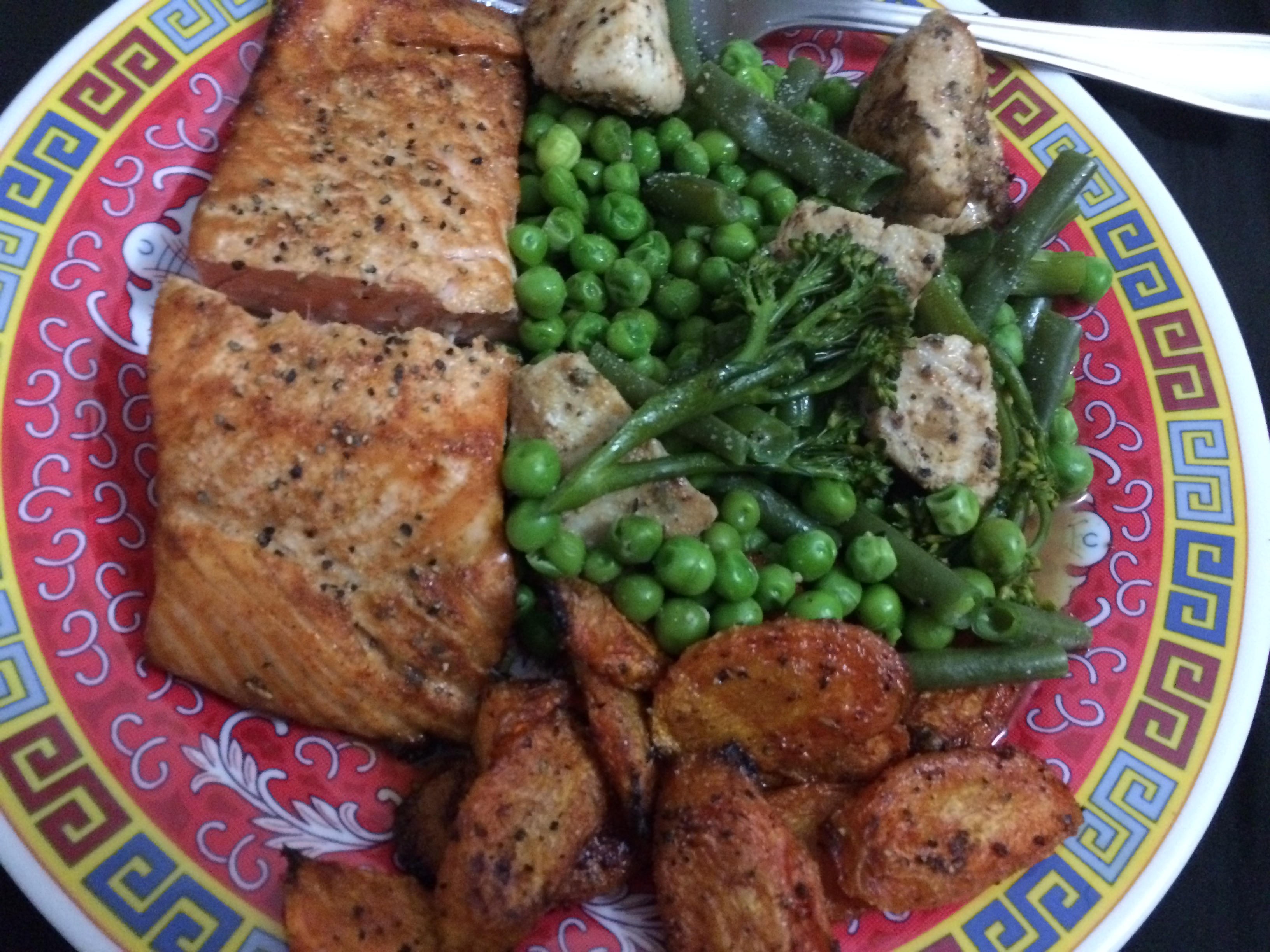 Dinner: soy salmon (p) with roast carrots (s), broccoli (s), green beans (s) and peas (p)