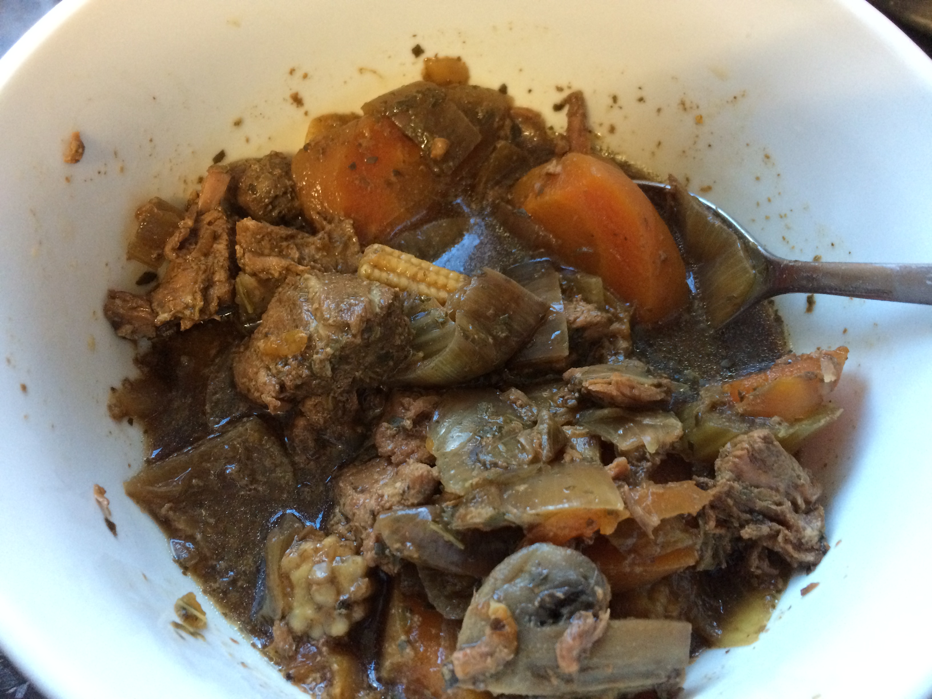 Dinner: beef (p) stew with carrots (s), onions (s), celery (s) and mushrooms (s) with pickled beetroot (s) and pickled cabbage (s) with sweetheart cabbage (s), baby corn (s) and mangetout (s) with half pack of jelly tots (3.5)
