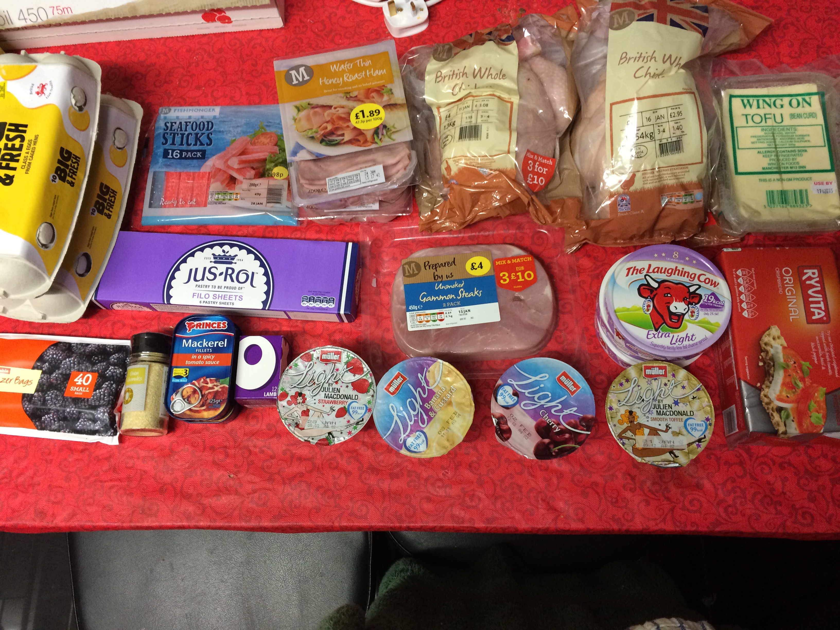 As promised, here’s my food shop from last night. I was a tad over budget (I bought a few things for next week – not sure why!) so I decided I’m going to alter my meals a bit for this week. Instead of KFC on Friday, I’m just going to replicate Monday’s treat dinner so I don’t have to spend any more money this week 🙂 and I forgot to freeze my curry so I’m just using some other stuff I have on hand for a couple of lunches instead.